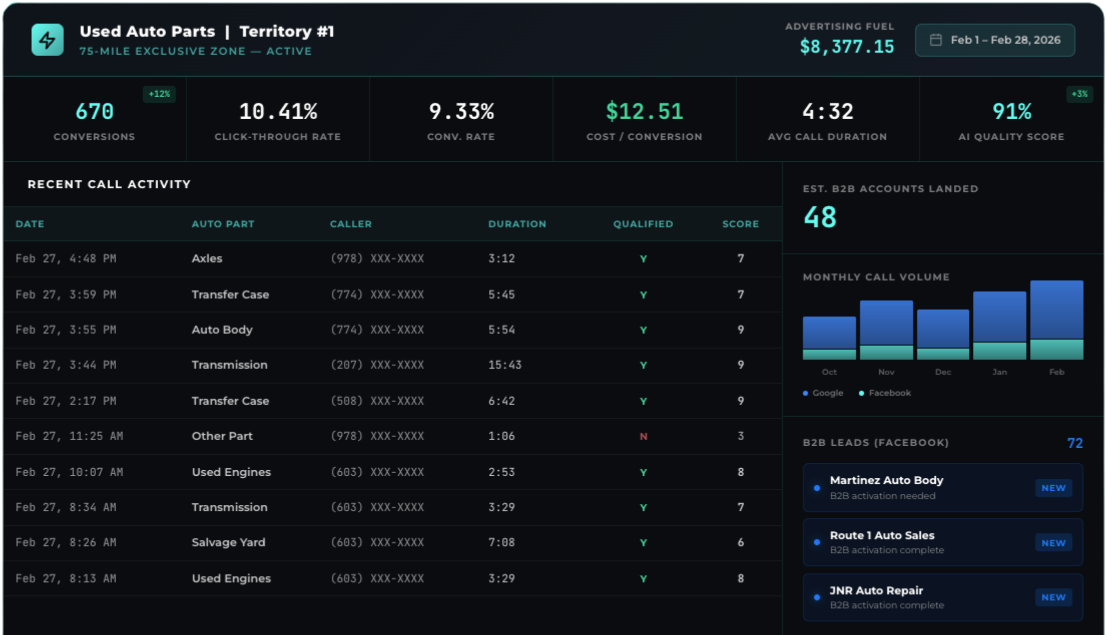Meanwhile, Facebook targets B2B accounts directly — repair shops, body shops, and dealerships — with messaging built for account activation. Two channels. One goal. B2B dominance across your entire territory.